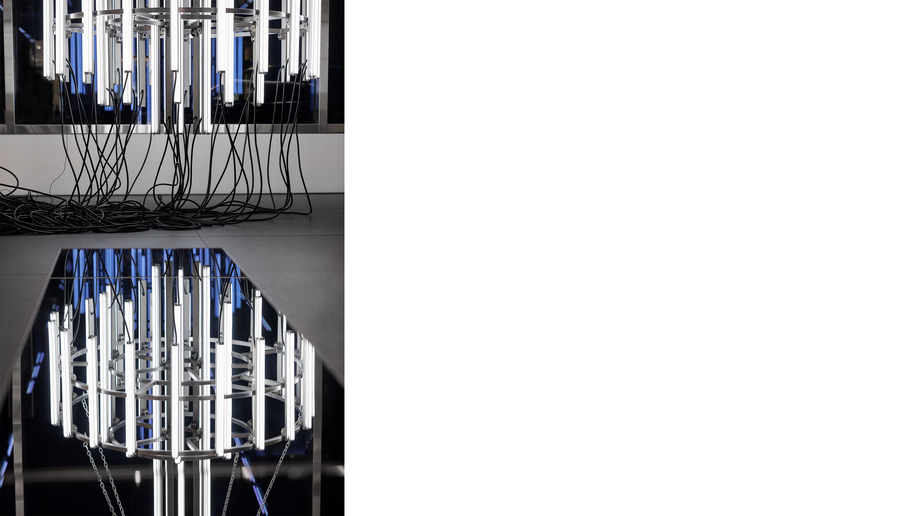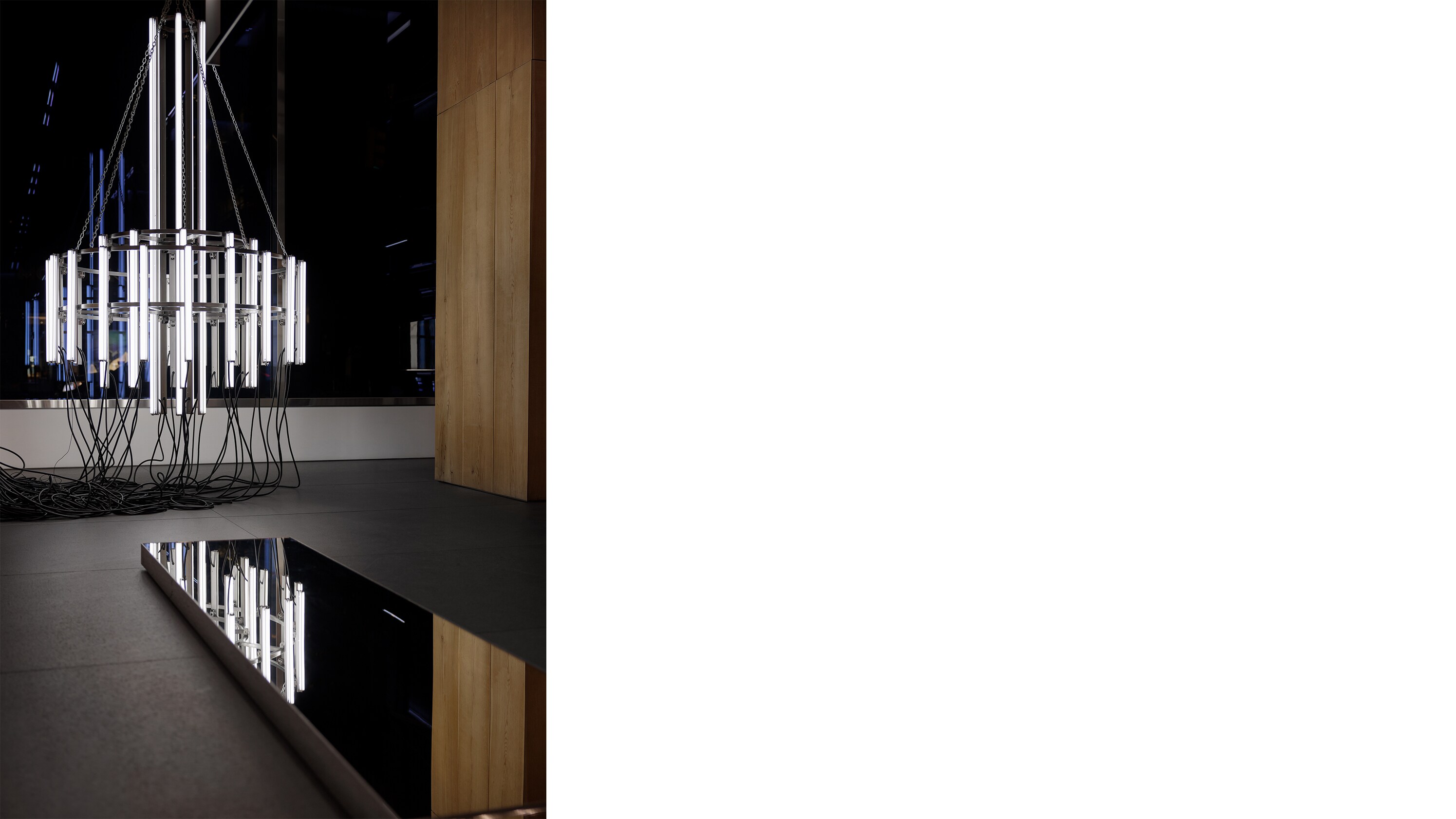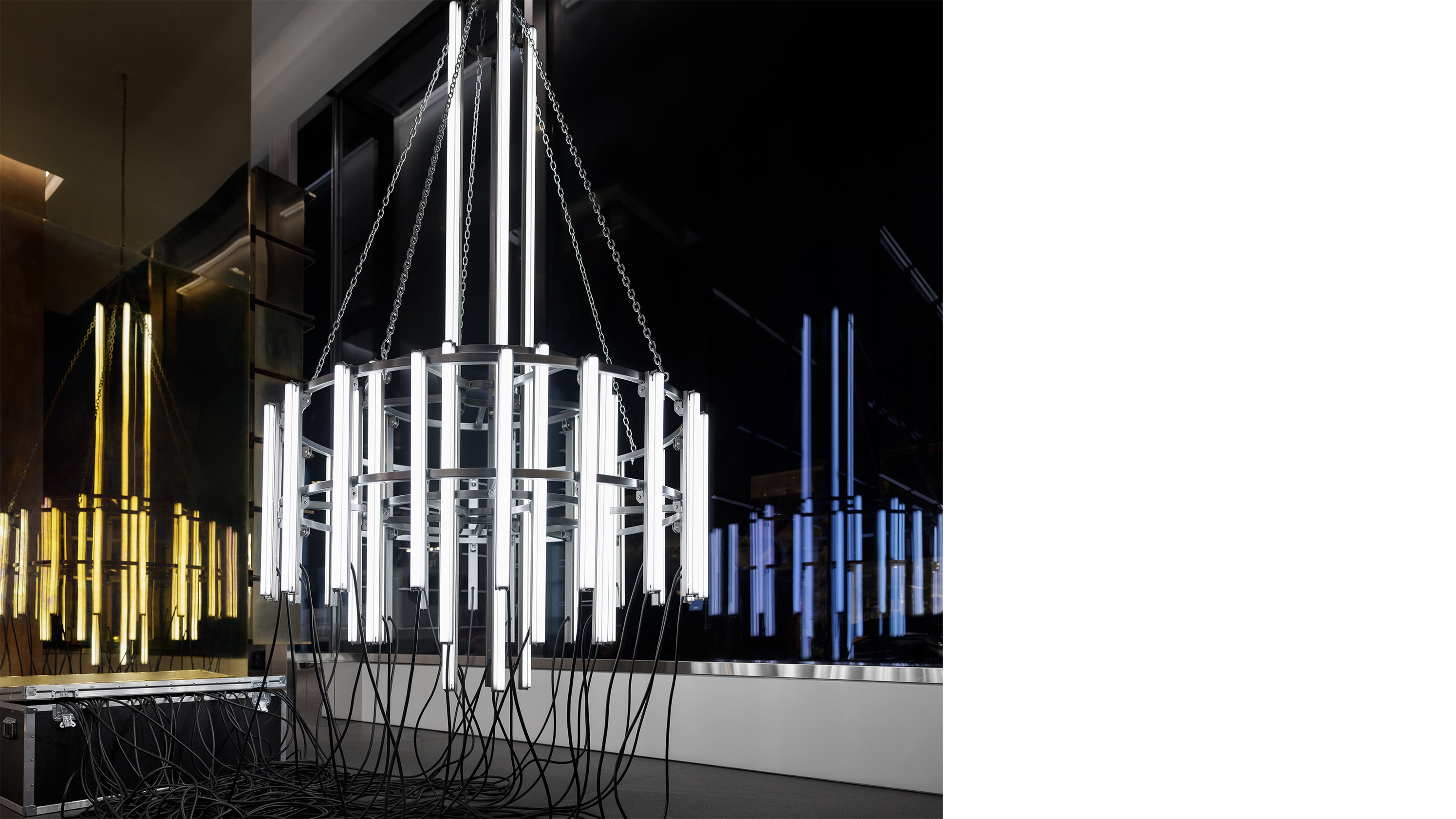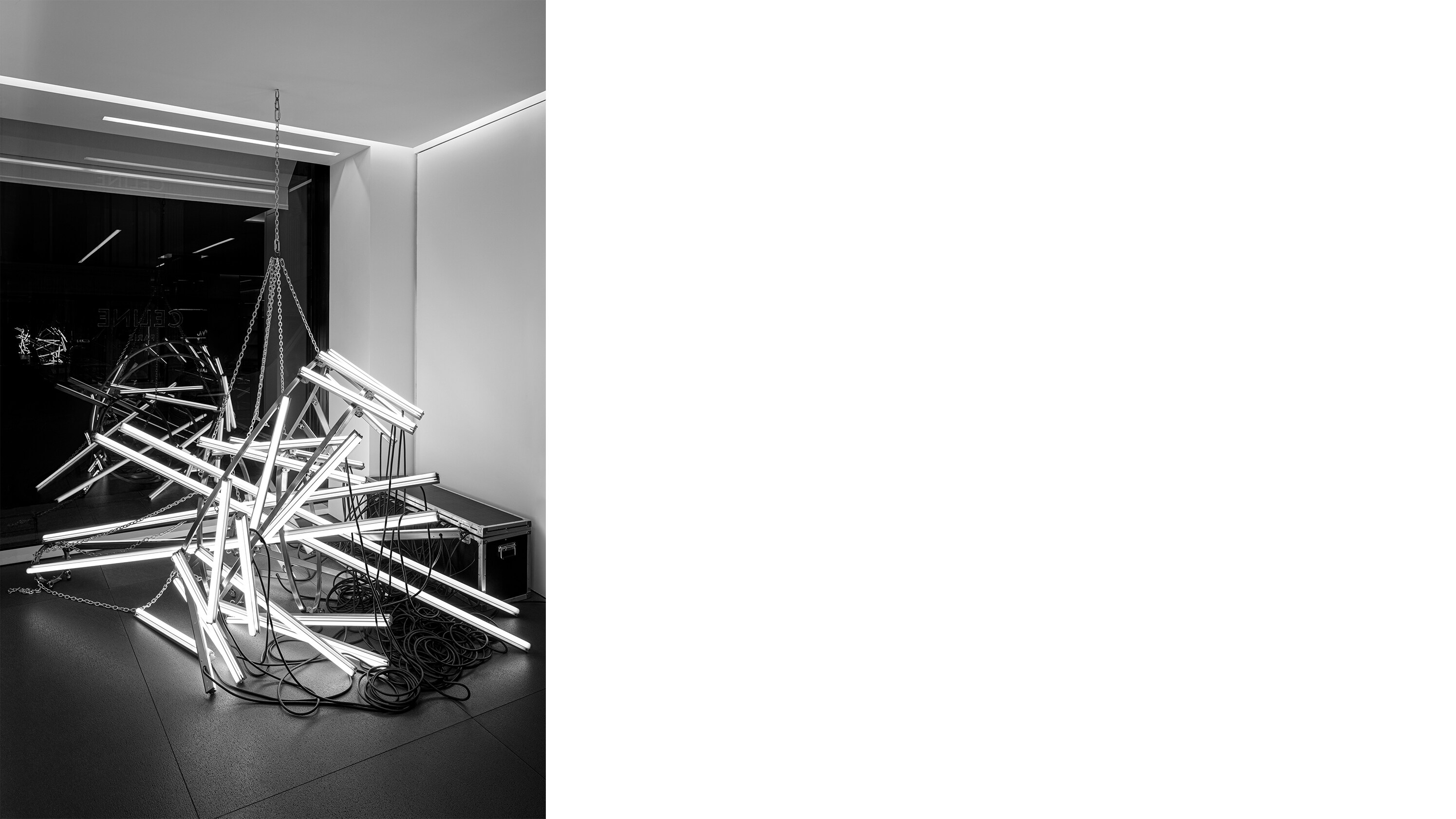 THE CHANDELIER STRUCTURES CREATED FOR THE STORES, ARE CLASSIC VIOLETTE. THE REPEATED MODULAR FORMS TAKE THE MINIMALIST FRAMEWORKS OF DAN FLAVIN OR SOL LE WITT AND PUSHES THEM INTO A DECONSTRUCTED STATE OF THEATRICAL COLLAPSE. VIOLETTE LIKENS THEM TO A FIGURE WHO HAS STUMBLED AND FALLEN. THEY ARE AN IMAGE OF OVERDOSE, EQUAL PARTS NARCOTIC COLLAPSE AND NARCAN REVIVAL. “I RELATE TO SCULPTURE AS THIS THING THAT EXTENDS ITSELF INTO THE SPACE OF A BODY SO IT’S OF NECESSITY ANTHROPOMORPHIZED – AND SO AUTOBIOGRAPHICALLY I WAS LIKE YEAH I KNOW ALL ABOUT THAT...” THE RESULTING SCULPTURES PERFECTLY CAPTURE THE EMOTIONAL TENOR OF THE TIMES: “IT’S AS IF ARISTOTLE WAS RAISED IN A WARZONE WHICH HE PROBABLY WAS, AND THE POETICS OF POST-TRAUMATIC STRESS DISORDER MEET THE AESTHETICS OF BOREDOM.” ADD TO THAT FASHION AND RETAIL, AND THE MEETING IS UNLIKE ANY OTHER.