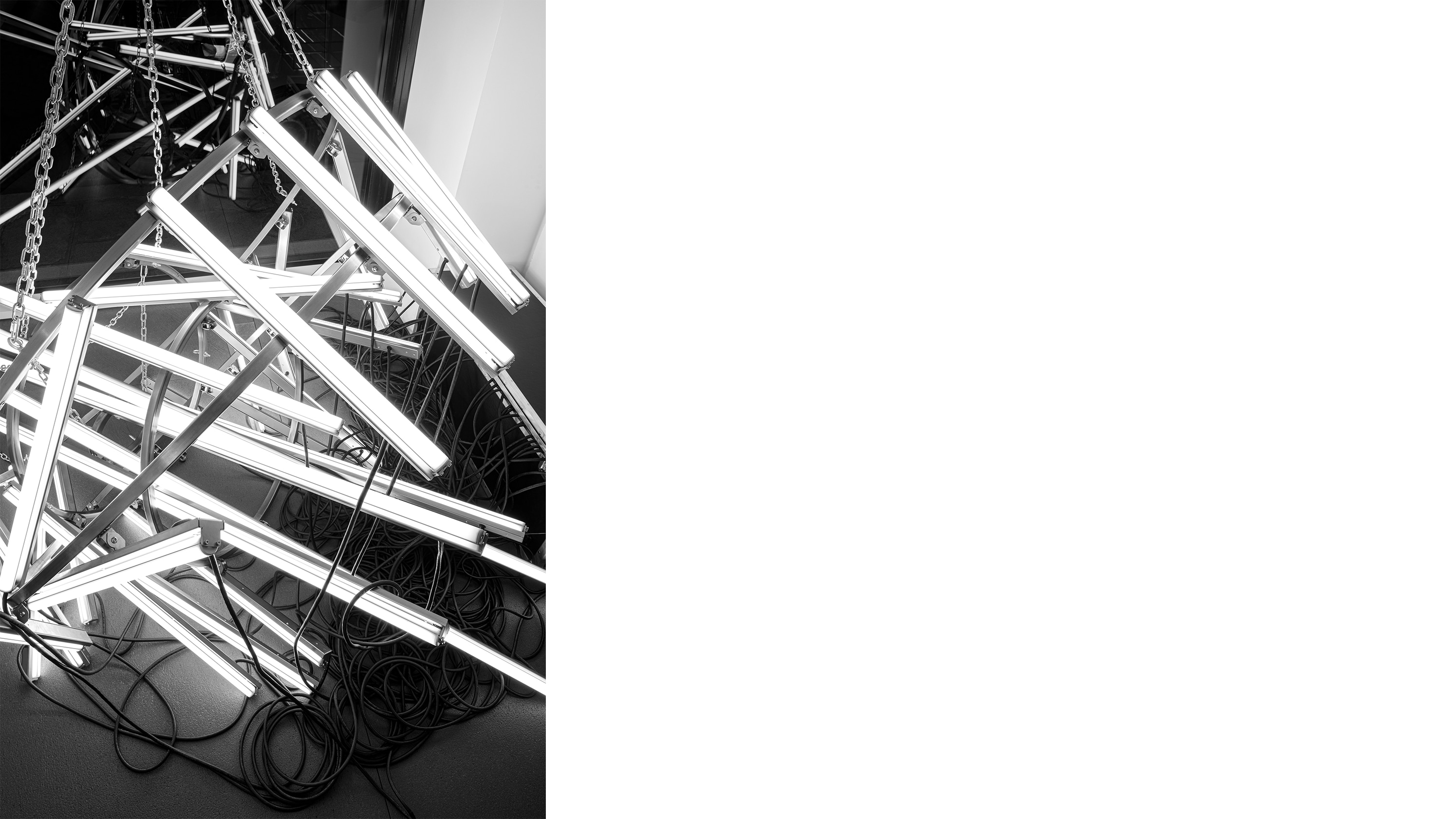 EVERY ERA HAS ITS DEFINING FIGURES, AND IN THE CONDENSED NEW YORK ARTWORLD OF THE EARLY AUGHTS, BANKS VIOLETTE WAS FOREMOST AMONGST THEM. OF THE MANY CURRENTS RUNNING THROUGH THAT SCENE, VIOLETTE’S WAS THE DARKEST AND MOST STRINGENT. BROKEN DRUM-SETS, SKELETAL ARCHITECTURES AND VACATED STAGES SPLINTERED BY SHARDS OF WHITE, FLUORESCENT LIGHT AND SET TO THE SUBSONIC UNDERTOW OF DEATH METAL’S SOCIETAL ANGST CAPTURED THE ZEITGEIST OF AN ERA’S PRECARIOUS BALANCE OF NIHILISM AND CELEBRATION. DRAWING FROM MUSIC, ART, THEATRE AND FASHION, VIOLETTE’S ART TOOK THE FORM OF A BAROGRAPHIC TRACE RECORDING THE PRESSURE THAT WAS THE SLOW IMPLOSION OF EVERYTHING AROUND IT - PRESSURE THE ARTIST EVENTUALLY SUCCUMBED WITHDRAWING FROM THE WORLD HE’D HELPED DEFINE.